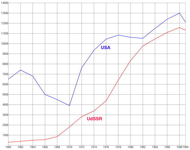 Anzahl der atomaren Gefechtsköpfe der USA und der UdSSR zwischen 1960 und 1989