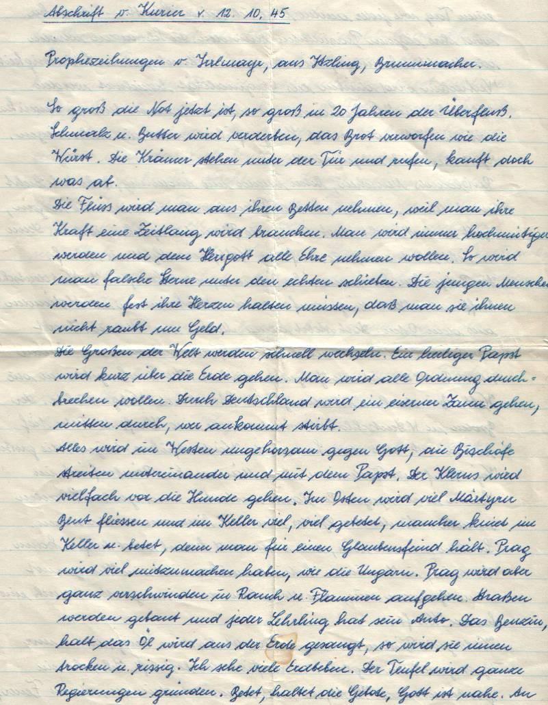 Im Jahre 2002 tauchte im Internet ein handschriftlicher Text auf, der Prophezeiungen von Alois Irlmaier wiedergeben und aus dem Jahre 1945 stammen soll.