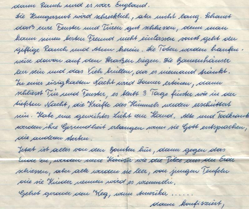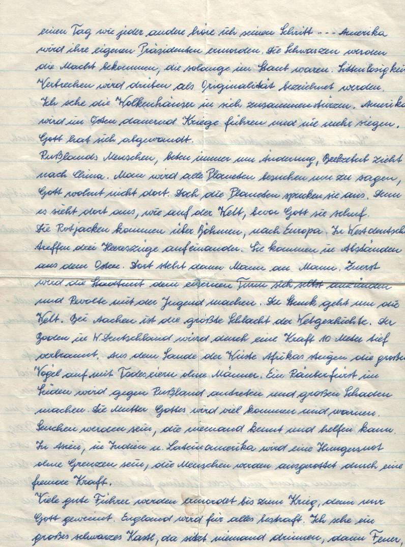 n dem gesamten handschriftlichen Text findet sich nicht ein einziger korrigierter Rechtschreibfehler und die Schrift ist sehr einheitlich. Es sieht tatsächlich so aus, als ob jemand, der es gewohnt war mit der Hand zu schreiben, den Text in einem Stück von einer Vorlage gewissenhaft und mit großer Übung abgeschrieben hat. (Das Wort "Prophezeihungen" zu Beginn ist allerdings falsch geschrieben.) Nach Angaben des Besitzers der Handschrift, war der Schreiber Jahrgang 1901 und starb 1998 - also VOR dem 11. September 2001! Die Schreibweise des großen W und V deuten auf jemanden, der noch vor dem Krieg zur Schule gegangen ist. Da der Text Voraussagen enthält, die sich quer über das 20. Jahrhundert verstreuen, würde selbst ein Entstehungszeitpunkt von spätestens 1990, bedeuten, dass der Schreiber (oder der Urheber der Ur-Quelle) seherische Fähigkeiten hatte. Denn es werden mehrere Dinge konkret vorausgesagt oder angedeutet, die sich erst nach 1990 ereigneten: